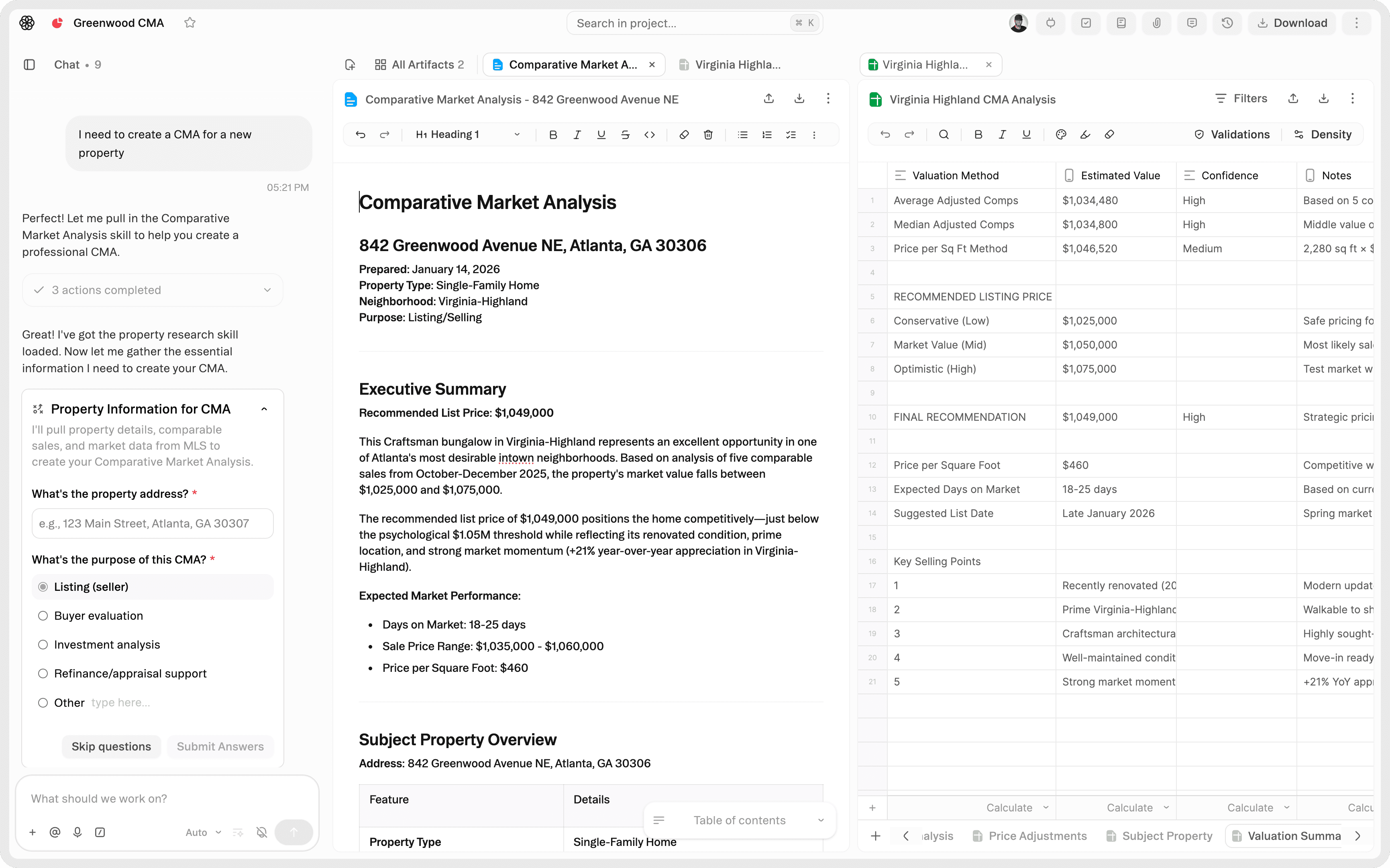 Build a comprehensive comparative market analysis for a listing presentation. Use sheet_operations, write_document, validate_data. Create: Comparable Sales workbook (recently sold properties with address, sale price, square footage, bedrooms, bathrooms, lot size, condition, days on market); Adjustment Calculations sheet (square footage adjustments, bedroom/bathroom count, condition differences, upgrades, location factors with dollar values); Price Analysis (price per square foot by neighborhood, absorption rates, competitive listings); Pricing Strategy document (aggressive, moderate, conservative scenarios with expected days on market and rationale); Market Trends analysis (90-day sales velocity, inventory levels, buyer demand indicators); Presentation deck with property highlights, comp analysis, and pricing recommendation. Output: Complete CMA with data-backed pricing strategy and professional presentation materials.